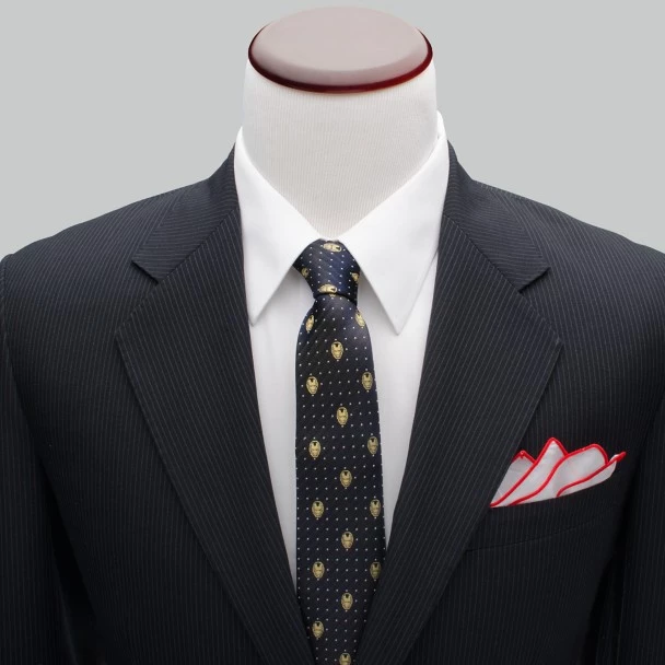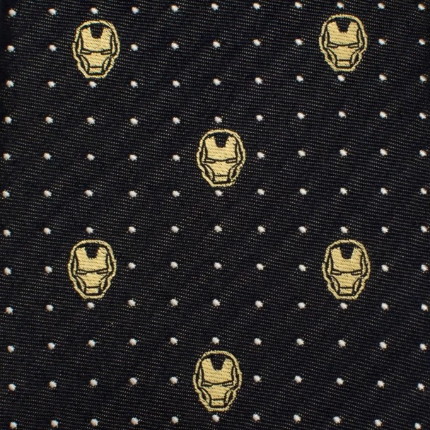 You’ll show off your strong sense of style with this silk Iron Man tie. The Avenger’s distinctive helmet is embroidered in the allover design of this tie, which features polka dots on the subtle gray and black striped weave.