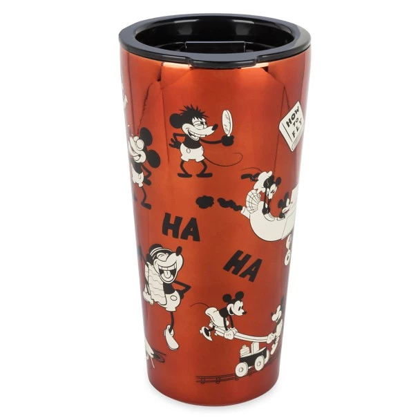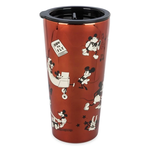 Keep your drink cool with Mickey and Minnie Mouse. This stainless steel drink carrier features all over screen print of Mickey and Minnie in classic cartoon form and comes with a secure lid for safe travels!