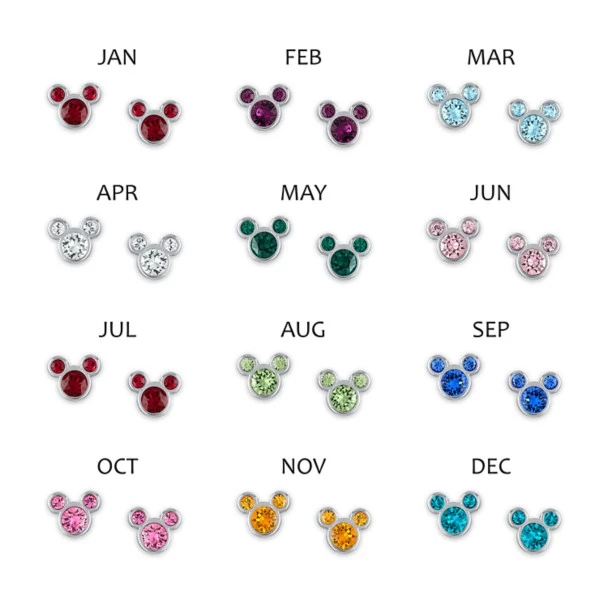 Celebrate your birthday all year long with these stunning birthstone crystal earrings fashioned into Mickey Mouse icons. Available in 12 different options, the crystals are hand set and colored to match the birthstone for the respective month. Sterling silver finish and titanium posts make these an elegant choice.