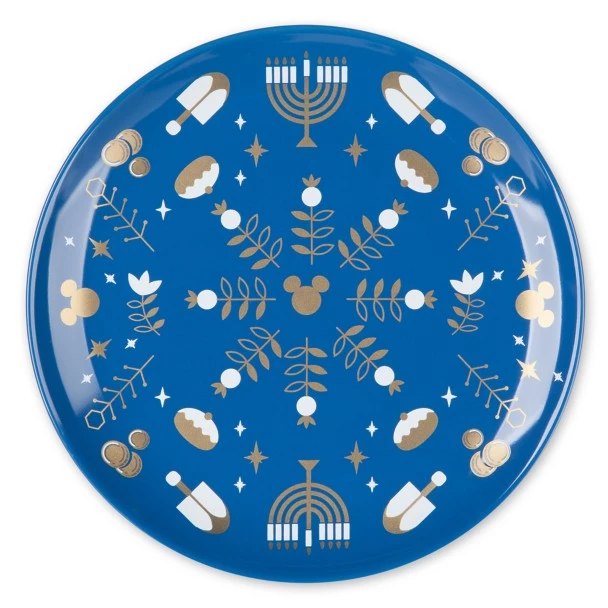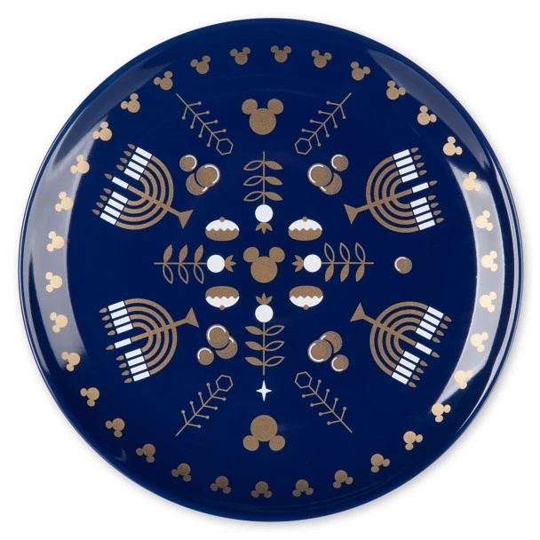 The Festival of Lights sparkles even brighter with this set of four Mickey Mouse Hanukkah salad plates. Each ceramic plate features a different design starring Mickey icons, menorahs, dreidels, stars, coins, and sufganiyots jelly doughnuts. It’s a sweet hint that these pretty blue, gold and white plates aren’t just for salad.