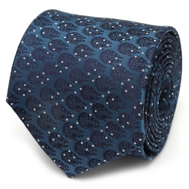 Teal and electric blue threads combine to form this elegant 100% silk tie. The Millennium Falcon darts across in neat rows, covered in a series of tiny silver dots reminiscent of all the stars in a galaxy far, far away.