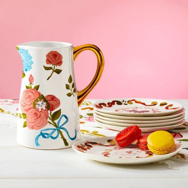 This set of four plates will make dinner time purrr-fect This porcelain plate set features designs of lovable characters from Disney’s The Aristocats, including Marie, Berlioz, Toulouse, and Roquefort.