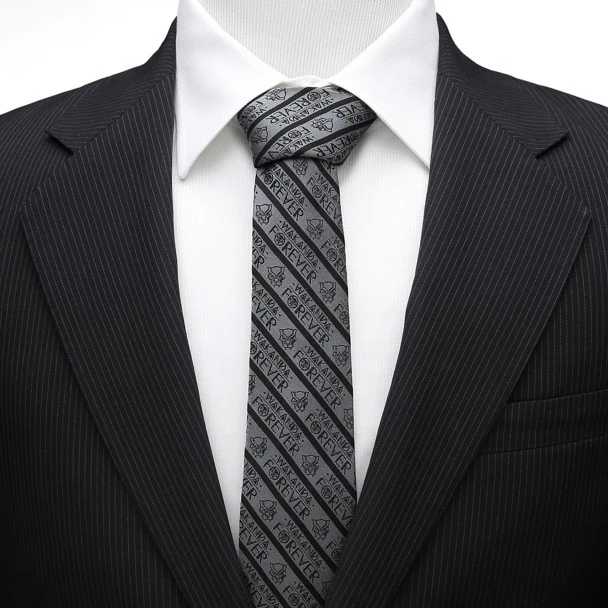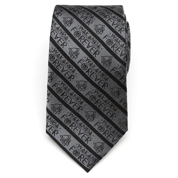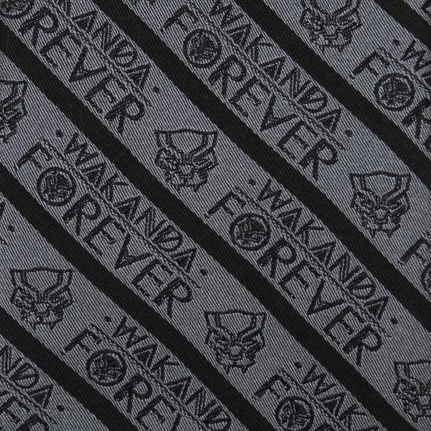 A dusky gray forms the background for this silk tie that features the logo of the Black Panther throughout its diagonal stripes. Stylized letters stamp out the words ”Wakanda Forever” in neat rows, ensuring this tie becomes part of your favorite formal look.